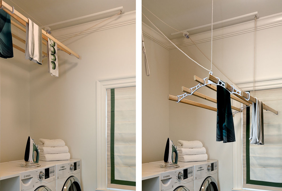 Для вещей, которые требуют воздушной сушки, можно установить потолочные системы, которые были популярны в Англии на протяжении веков. Эти системы легко регулируются по высоте.